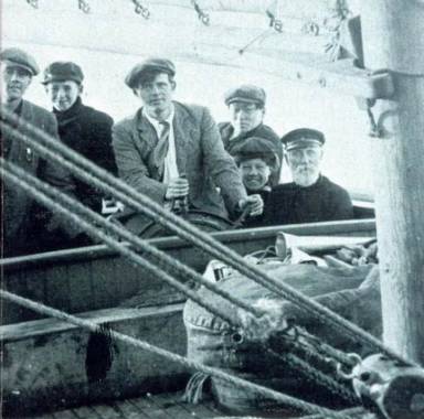 (The Crew of The Snark. London, center, Charmian, and Roscoe at far right.)