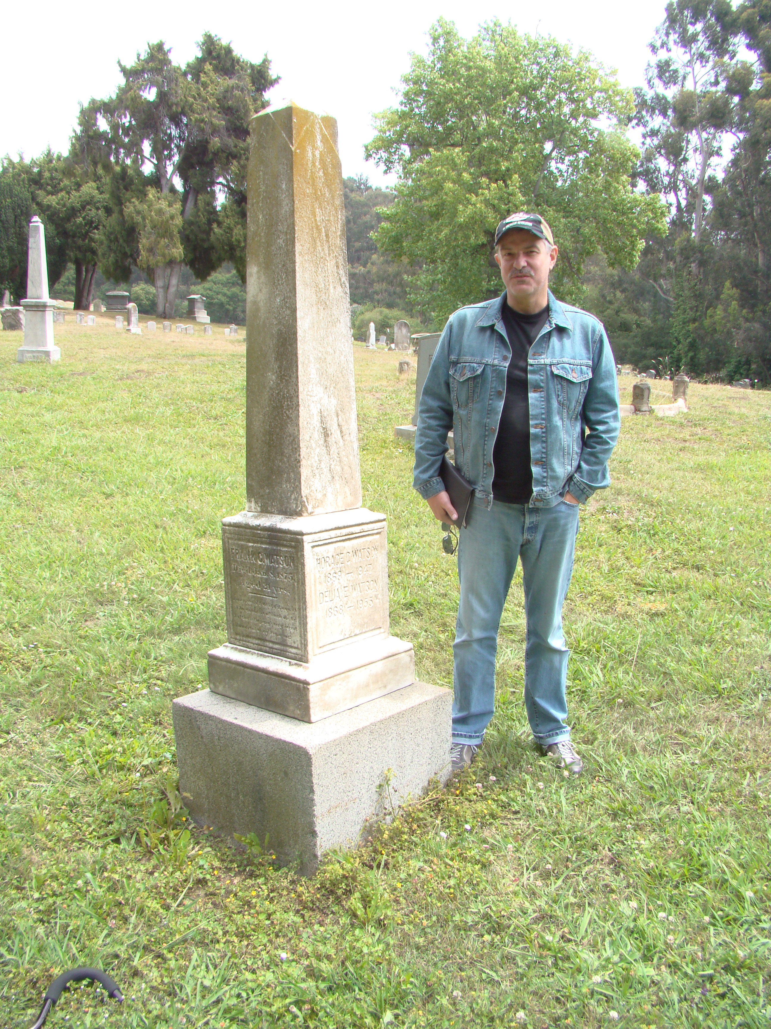 Yours truly at one of the Watson markers in Plot No. 1 of Oakland’s grand old Mountain View Cemetery. Horace C Watson and his wife Delia are on this monument, as is JBW’s son Frank. JBW has no marker here, and neither does Hettie, but cemetery records confirm that they are in fact there.
